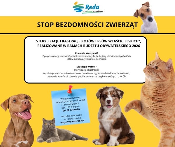 Mieszkańcy Redy mogą skorzystać z programu finansującego bezpłatną sterylizację i kastrację psów oraz kotów właścicielskich. To element projektu z Budżetu Obywatelskiego 2026 pod nazwą „STOP Bezdomności zwierząt – sterylizacje i kastracje kotów i psów właścicielskich”. Celem jest ograniczenie bezdomności zwierząt i wsparcie odpowiedzialnej opieki nad pupilami.