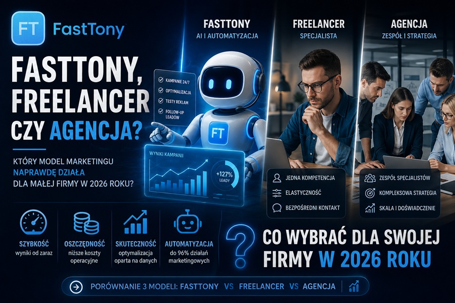 Do niedawna właściciel małej firmy miał dwie opcje: zatrudnić freelancera albo podpisać umowę z agencją. Dziś pojawił się trzeci model — platformy AI, które automatyzują marketing bez udziału człowieka. Polska platforma FastTony jest jednym z najgłośniejszych przykładów tego trendu. Ale czy automatyzacja naprawdę zastępuje specjalistę? I dla kogo każde z tych rozwiązań ma faktyczny sens?